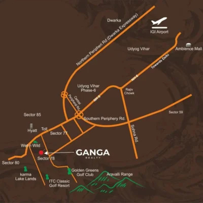 Ganga Valley NXT 78 is a 15-minute drive from IGI Airport via NPR and just 1.5 km from the under-construction Sector 78 Metro Station.